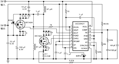 如果USB外設需要5V電源,事情就稍為有些棘手,因為USB口的外供電壓可能略高于也可能略低于這一數(shù)值。為此,以往常用先升壓再降壓或先降壓再升壓的辦法。這在需要多種輸出電壓的場合,倒也不失為一條可行途徑;但若僅需單一的5V輸出,此類電路結構便難免“疊床架屋”之嫌?;蛟S正是這一緣故,上述之SEPIC盡管電路復雜,成本也高,但因其能集升壓、降壓功能于一身,所以近來已呈應用漸廣之勢。