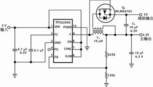 圖2是一種設計頗為緊湊的雙電壓輸出電路,工作頻率750kHz,變換效率可達95%。其中,3.3V主電源由降壓型單片同步開關電源TPS62000構成;該器件具有軟啟動功能,能夠有效抑制輸入浪涌電流與輸出電壓過沖,最大輸出電流600mA。TPS62000的輸出端“L”為低電平時,外接P溝道場效應管Q1隨之導通而令儲能電感L1副繞組的感應電壓向輸出電容C1充電,C1之端電壓同3.3V主輸出疊加即為輔助輸出電壓,其數(shù)值取決于L1主、副繞組的匝數(shù)比;輔助輸出若為5V,匝數(shù)比可取2:1。