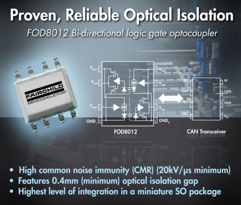 為幫助設計人員應對挑戰(zhàn),飛兆半導體公司(Fairchild Semiconductor)開發(fā)出業(yè)界首款全雙工、雙向邏輯門光耦合器FOD8012,它具有高抗噪能力和經(jīng)驗證的可靠光隔離性能,適用于工業(yè)現(xiàn)場總線通信、可編程邏輯控制、伺服控制,以及逆變器、工廠自動化、過程控制和測試測量等應用。
