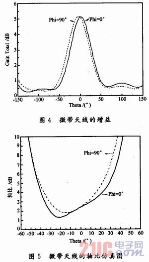 由圖4可以看到,雙層微帶天線的增益達(dá)到了5.2dB,較之傳統(tǒng)的微帶天線增益有少許增加,由此可見(jiàn),雙貼片的微帶天線在提高增益方面也有一定的貢獻(xiàn)。若要大幅度提高微帶天線的增益,則可以在頂層貼片上再覆蓋一層εr>>1的介質(zhì)基板即可。從圖5中可以看出,微帶天線的部分軸比小于3dB,從而實(shí)現(xiàn)了天線的圓極化,但是微帶天線的最大輻射方向偏離軸向,天線的軸向比變差。該微帶天線基本可以滿足圓極化的要求。