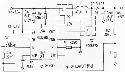 最近廠家生產(chǎn)出了帶負載切斷功能的升壓型變換器IC,使用時采用圖1所示的電路。在待機時借助于P溝道MOSFET Tr2的截止,切斷輸入端和輸出端的直流通路。