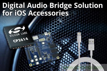 【導(dǎo)讀】近日,Silicon Labs(芯科科技有限公司)宣布,推出一款數(shù)字音頻橋接芯片CP2614和評(píng)估套件,旨在簡(jiǎn)化iOS設(shè)備配件的開(kāi)發(fā)以及助力于iOS設(shè)備配件的創(chuàng)新。CP2614為各類使用全數(shù)字閃電連接器的MFi設(shè)備(Made for iPod、iPhone或iPad)提供完整交鑰匙音頻橋接解決方案,同時(shí)也包括各類音頻配件。