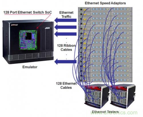 今天,以太網(wǎng)交換機和路由器已達到 256 個端口(到年底將會增加到 1024 個端口),而且它們可處理高達 120 Gb/s 的流量。同時,網(wǎng)絡(luò)交換的延遲也在持續(xù)下降中,最低延遲已降至 1 µs。所有這些因素促使如今的網(wǎng)絡(luò)交換機和路由器芯片成為有史以來最大規(guī)模的芯片,達到了五億門級。在流片完成之前驗證此類復(fù)雜 IC 設(shè)計是一項難以完成的任務(wù)。我們來考慮下具有 128 端口以太網(wǎng)接口的 SoC 設(shè)計。
