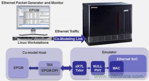 在此場景中,以太網(wǎng)測試儀模型運行于連接到硬件仿真器的Linux工作站上。基于成熟的實現(xiàn) IP,模型準確再現(xiàn)了實際的物理測試儀。這種虛擬測試儀包括以太網(wǎng)數(shù)據(jù)包生成器和監(jiān)視器 (EPGM),可以為 1G、10G、40G/100G 和 120G 網(wǎng)絡(luò)分別配置 GMII、XGMII、XLGMII/CGMII 和 CXGMII 接口。每個支持的MII端口都需要一個 xRTL 事務(wù)處理器(圖 2)。