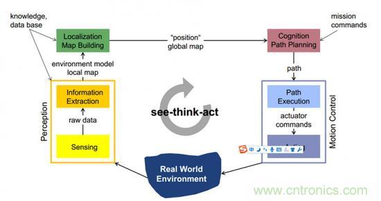 機器人天然的工作模式是“see-think-act”,所以自然而然的就形成了“傳感——計劃——行動”(SPA)結構:從感知進行映射,經(jīng)由一個內(nèi)在的世界模型構造,再由此模型規(guī)劃一系列的行動,最終在真實的環(huán)境中執(zhí)行這些規(guī)劃。與之對應的軟件結構稱為經(jīng)典模型,也稱為層次模型、功能模型、工程模型或三層模型,這是一種由上至下執(zhí)行的可預測的軟件結構。
