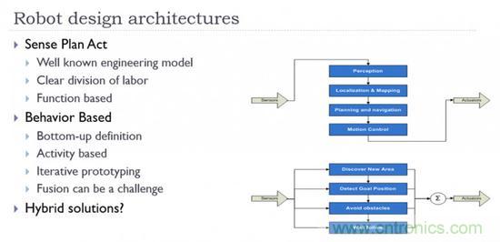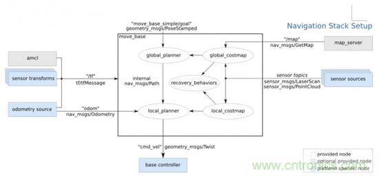 沒有萬靈的結構,混合系統(tǒng)結合了SPA和反應體系的原理,將多種混合系統(tǒng)應用于在傳感器和電機輸出間進行協(xié)調(diào)來完成任務?;旌辖Y構相結合最具吸引力的好處可能是:系統(tǒng)按照有利于完成任務的標準進行設計,而非刻板的遵循某一教條。但再復雜的機構,基本上也都是二者的組合。以ROS的導航包為例:
