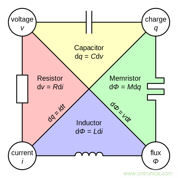 ▲ 電阻器、電容器、電感器和憶阻器概念之間的對(duì)稱性。