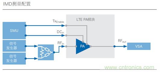 圖7: IMD測(cè)量需要連接至功率組合器的兩個(gè)信號(hào)產(chǎn)生器