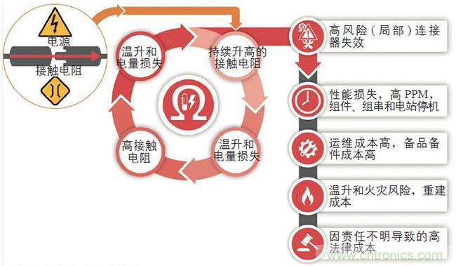 電站的盈利能力與選擇高質(zhì)量的部件息息相關(guān)。業(yè)主在光伏連接器上節(jié)省資金,并不是一種明智的做法。因為,不注重質(zhì)量,通常意味著后續(xù)的高損失和風(fēng)險,而這些本可避免。光伏連接器的低接觸電阻及長期可靠性,能夠保障電站高效和安全運(yùn)行。而持續(xù)升高的接觸電阻會導(dǎo)致光伏項目的安全風(fēng)險大幅提高,降低電站運(yùn)行效率。需要指出的是,各種不同的風(fēng)險因素是密切相關(guān)的,如圖1 所示。