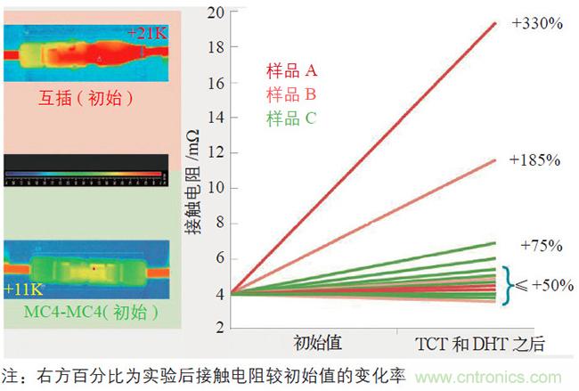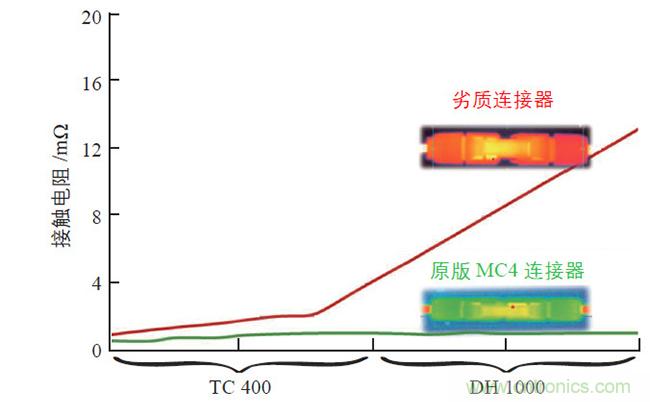 從光伏連接器的外觀和質(zhì)感可大致了解該產(chǎn)品的外形設(shè)計及絕緣材料的選擇。但是,評價光伏連接器好壞的核心指標(biāo)是公母連接器對插之后的接觸電阻。一個高質(zhì)量的連接器須具有很低的接觸電阻,并能夠長期維持這種低接觸電阻狀態(tài)。根據(jù)光伏連接器最新國際標(biāo)準(zhǔn)IEC 62852,公母對插后的接觸電阻在TC200+DH1000 測試后,增量不能大于5 mΩ或者電阻終值小于初始值的150%。而這僅是最低要求,不同廠商連接器的接觸電阻值取決于制造商的技術(shù)水平。對于如何評判接觸電阻,TC400(2×TC200)和DH1000 實驗提供了一個解讀方向。圖2 為實驗比較后的結(jié)果,由圖2 可知,高質(zhì)量的光伏連接器的接觸電阻非常穩(wěn)定,這主要得益于其所使用的電連接技術(shù)。因此,客戶在選擇光伏連接器時,須對其所使用的核心技術(shù)進(jìn)行全面的了解。