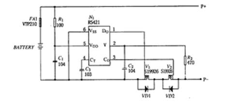 鋰離子電池保護電路包括過度充電保護、過電流/ 短路保護和過放電保護等,該電路就是要確保這樣的過度充電及放電狀態(tài)時的安全,并防止特性劣化。它主要由集成保護電路IC、貼片電阻、貼片電容、場效應管(MOSFET) 、有的還有熱敏電阻(NTC) 、識別電阻( ID) 、保險絲( FUSE) 等構(gòu)成。其電路圖如圖1所示。
