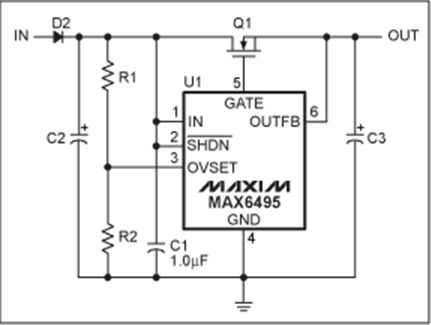 過壓保護(hù)(OVP)器件數(shù)據(jù)資料中提供的典型電路可以滿足大多數(shù)應(yīng)用的需求(圖1)。然而,有些應(yīng)用需要對基本電路進(jìn)行適當(dāng)修改。本文討論了兩種類似應(yīng)用:增大電路的最大輸入電壓,在過壓情況發(fā)生時利用輸出電容存儲能量。
