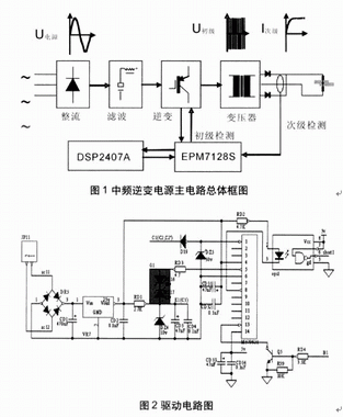 中頻逆變直流電阻焊機(jī)的供電電源是由三相工頻交流電源經(jīng)整流電路和濾波電容轉(zhuǎn)換成直流電源,再經(jīng)由功率開(kāi)關(guān)器件組成的逆變電路轉(zhuǎn)換成中頻方波電源,然后輸入變壓器降壓后,經(jīng)低管壓降的大功率二極管整流成直流電源,供給焊機(jī)的電極,對(duì)工件進(jìn)行焊接(見(jiàn)圖1)??刂齐娐凡糠钟蒁SP和CPLD組成,DSP(TMS320LF2407A)產(chǎn)生的PWM波和檢測(cè)信號(hào)、保護(hù)信號(hào)在CPLD(EPM7128S)里現(xiàn)實(shí)邏輯運(yùn)算。