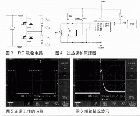 本文采用普通散熱器與強(qiáng)迫風(fēng)冷相結(jié)合的措施,并在控制電路上加過(guò)熱檢測(cè)保護(hù)電路,應(yīng)付IGBT與散熱器接觸不良或者非正常情況,在IGBT散熱片上安裝熱敏電阻,然后通過(guò)邏輯判斷電路給出信號(hào),供控制電路處理(見(jiàn)圖4)。