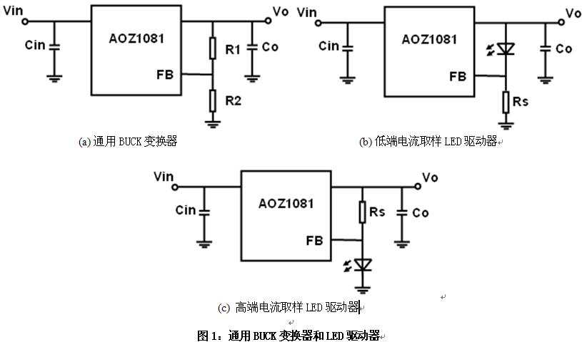 本文將基于AOZ1081來介紹反饋環(huán)的設(shè)計,因此先介紹一下AOZ1081的工作特點。AOZ1081是一款降壓型Buck變換器,工作于電流模式,其特點可以讓它配置成LED驅(qū)動器,同時也可以作為通用Buck變換器使用。其特點如下: