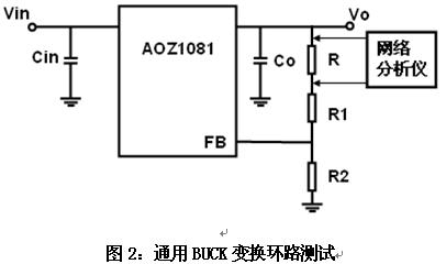 對于通用BUCK降壓型變換器,可以直接在反饋分壓電阻器上部電阻中,直接串接一個100歐姆的電阻R,由R注入測試信號,測量增益裕量和相位裕量,用于決定的系統(tǒng)的穩(wěn)定程度,如圖2所示。注意到,相對于輸出的負(fù)載電阻,此回路相當(dāng)于一個高阻抗回路,因此不影響系統(tǒng)的正常工作。
