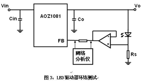 這樣,就必須引入一種隔離的電路,使注入的信號不影響電源系統(tǒng)的正常工作。通常,電壓跟隨器具有阻抗變化,也就是其輸入相當(dāng)于開路,輸出相當(dāng)于短路,同時,時還具有緩沖的作用,也就是在信號源和負(fù)載之間緩沖,將輸入信號無損耗的輸出。因此,可以使用圖3的電路測量LED驅(qū)動器的環(huán)路穩(wěn)定性。