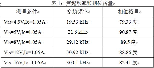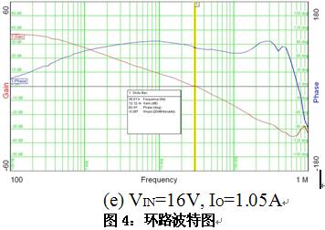 基于AOZ1081設(shè)計LED驅(qū)動器,輸入電壓4.5 V到16 V,輸出為一個HB LED,;使用Venable的3120測量環(huán)路,Rc=61.9kohm,Cc=820pF,測量波形和結(jié)果如圖4和表1所示。
