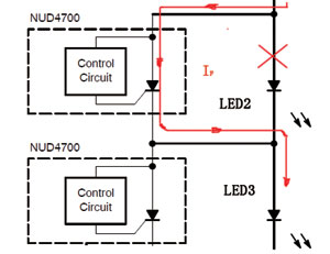 NUD4700的典型應(yīng)用電路如圖4所示。這是一個(gè)交流供電,往AC/DC轉(zhuǎn)換器輸出直流電壓,再由NUD4701恒流LED驅(qū)動(dòng)器驅(qū)動(dòng)5個(gè)串聯(lián)的1W大功率LED的電路。NUD4700與LED并聯(lián)連接在一起。在LED未開路時(shí),由于LED的正向降壓VF小于晶閘管的“開啟”電壓V(BR),則NUD4700為“關(guān)閉狀態(tài)”。在關(guān)閉狀態(tài)時(shí),只有小于250μA的漏電電流經(jīng)過NUD4700,相當(dāng)于NUD4700“開路”,不影響LED的工作。若串聯(lián)的LED中有一個(gè)(如LED2)因損壞而開路了,此時(shí)與LED2并聯(lián)的NUD4700的A、C之間電壓超過了“啟動(dòng)”電壓V(BR)(5.5~7.5V),NUD4700啟動(dòng),由關(guān)閉狀態(tài)轉(zhuǎn)為“導(dǎo)通狀態(tài)”。在導(dǎo)通狀態(tài)時(shí),A、C之間導(dǎo)通電壓VT為1.0~1.2V。此時(shí),LED的電流由LED1流經(jīng)NUD4700的A、C,再流入LED3,如圖5所示。5個(gè)LED的燈僅有4個(gè)LED工作,其亮度稍差一些,但仍可以正常工作,并且不影響其恒流的大小。