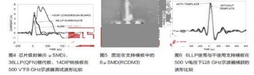 已經(jīng)在三種條件下使用6 μSMD 裸片來進行CDM測試:僅器件本身、器件貼裝在14DIP轉(zhuǎn)換板上,以及在36LLP替代板(Surrogate Board)上,如圖3所示。圖4顯示了這三種條件下以500 V電壓采用8 GHz示波器所獲得的CDM測試波形。這些結(jié)果顯示,貼裝在電路板上會增加施加給集成電路的應(yīng)力。36LLP替代板上應(yīng)力的增加頗為適度,可以視為易于操作性與更可靠測試結(jié)果之間的最佳折衷。貼裝在14DIP轉(zhuǎn)換板上的應(yīng)力增加更為嚴重,大概不是一個可接受的折衷辦法。好消息是36LLP替代板實際上比測試期間會移動的14DIP轉(zhuǎn)換板更易于操作。