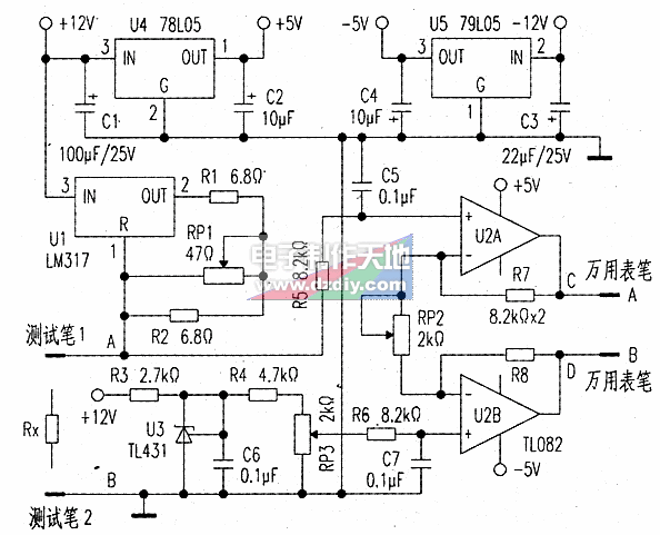 由運算放大器U2A和U2B及R7、R8、RP2(精密電位器)構(gòu)成電壓放大電路,對被測電阻兩端的電壓進行10倍放大,這樣數(shù)字萬用表從C、D兩點測得的電壓值就可以與被測電阻RX的阻值相對應(1mV對應1mΩ,1V對應1Ω)。