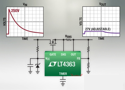 近日,凌力爾特公司推出過壓保護控制器 LT4363,該器件為高可用性電子系統(tǒng)提供了過壓和過流保護。當流過長電感性電源總線的電流突然變化時,就會發(fā)生電源電壓浪涌。另外,汽車電池還會經(jīng)歷一種稱為負載突降的情況,在這種情況下,電壓會在持續(xù)多個 ms 的時間里處于上升狀態(tài)。傳統(tǒng)的保護電路依靠笨重的電感器、電容器、保險絲和瞬態(tài)電壓抑制器。而 LT4363 通過簡單地控制一個 N 溝道 MOSFET,實現(xiàn)了可靠、自適應(yīng)和節(jié)省空間的設(shè)計。只有控制器和 MOSFET 經(jīng)受高壓浪涌,下游組件可以提供較低電壓的額定值,因此節(jié)省了成本。