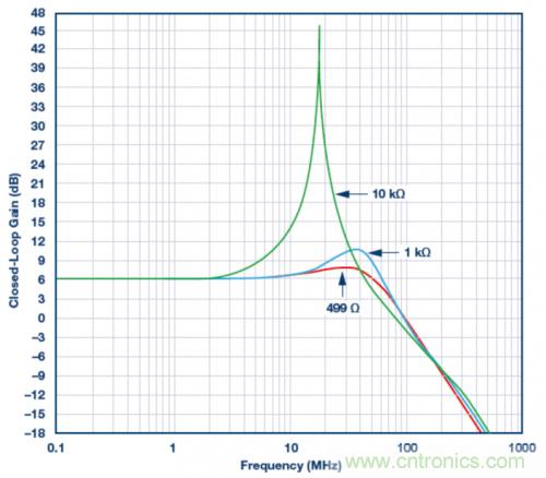 圖1的示例顯示小信號閉環(huán)增益與ADA4807-1電壓反饋型放大器頻率響應的實驗室結果,采用同相增益為2的配置,反饋電阻為499 ?、1 k?和10 k?。數據手冊建議RF值為499 ?。