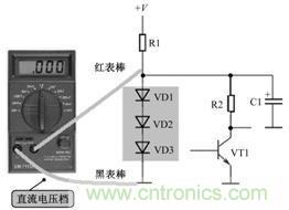 檢測(cè)這一電路中的3只二極管最為有效的方法是測(cè)量二極管上的直流電壓,如圖所示是測(cè)量時(shí)接線示意圖。如果測(cè)量直流電壓結(jié)果是1.8V左右,說明3只二極管工作正常;如果測(cè)量直流電壓結(jié)果是0V,要測(cè)量直流工作電壓+V是否正常和電阻R1是否開路,與3只二極管無(wú)關(guān),因?yàn)?只二極管同時(shí)擊穿的可能性較?。蝗绻麥y(cè)量直流電壓結(jié)果大于1.8V,檢查3只二極管中有一只開路故障。