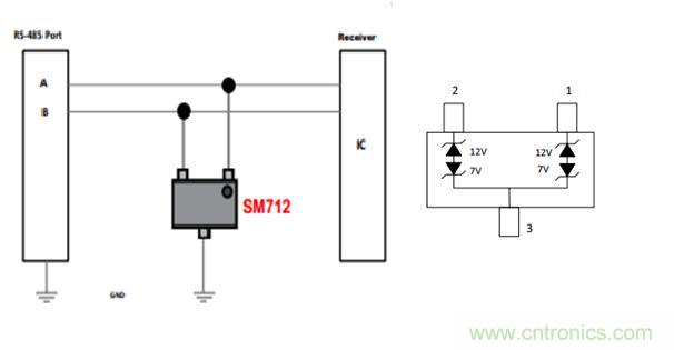 對(duì)RS485接口的特點(diǎn)是收發(fā)電平的不對(duì)稱,為7V 和12V,所以需要專門(mén)設(shè)計(jì)不對(duì)稱的保護(hù)芯片,而SM712 SOT-23封裝,專為保護(hù)具有非對(duì)稱工作電壓(-7V至12V)的RS-485應(yīng)用而設(shè)計(jì),使其免受靜電放電(ESD)、電氣快速瞬變(EFT)和雷電引致的浪涌電流帶來(lái)的危害。 它能吸收高于IEC 61000-4-2國(guó)際標(biāo)準(zhǔn)規(guī)定之最高級(jí)別的反復(fù)性ESD放電 30KV,無(wú)需擔(dān)心其性能發(fā)生減退,并可在極低的箝位電壓下安全地耗散19A的8/20μs波形浪涌電流(IEC61000-4-5)。