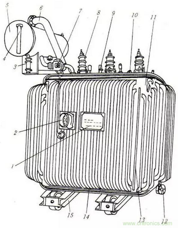 1-銘牌;2-信號式溫度計(jì);3-吸濕器;4-油標(biāo);5-儲油柜;6-安全氣道;7-氣體繼電器;8-高壓套管;9-低壓套管;10-分接開關(guān);11-油箱;12-放油閥門;13-器身;14-接地板;15-小車;16壓力釋放閥(補(bǔ)充:圖左上側(cè))