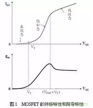 在VGS>VT時(shí),出現(xiàn)溝道,但如果源-漏電壓VDS=0,則不會(huì)產(chǎn)生電流;只有在VGS>VT和VDS>0時(shí),才會(huì)產(chǎn)生電流,這時(shí)必然有VDS >(VGS-VT),因此MOSFET處于溝道夾斷的飽和狀態(tài),于是源-漏電流隨柵-源電壓而平方地上升。相應(yīng)地,飽和跨導(dǎo)隨柵-源電壓而線(xiàn)性地增大,這是由于飽和跨導(dǎo)與飽和電壓(VGS-VT)成正比的緣故。