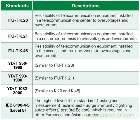 盡管客戶駐地設(shè)備(CPE)設(shè)計人員可采取三種基本的電路保護方案:氣體放電管(GDT)、瞬態(tài)電壓抑制(TVS)二極管陣列和保護型晶閘管,但他們所選擇的任何設(shè)備都必須使其設(shè)計最小程度地符合浪涌TIA-968B(以前稱為FCC第68部分)的要求。在美國,任何連接到公共交換電話網(wǎng)絡(luò)(PSTN)的通信設(shè)備均需具備此性能。其他國家也有類似要求,如表1所示。一些G.FAST供應(yīng)商可能會傾向于在美國市場采用符合GR-1089-Core的安全設(shè)計。