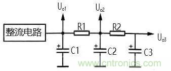 圖 4 所示是 π 型 RC 濾波電路。電路中的 C1、C2 和 C3 是 3 只濾波電容,R1 和 R2 是濾波電阻,C1、R1 和C2 構(gòu)成第一節(jié) π 型的 RC 濾波電路, C2、 R2 和 C3 構(gòu)成 第二節(jié) π 型 RC 濾波電路。由于這種濾波電路的形式 如同希臘字母 π 和采用了電阻器、電容器,所以稱為 π 型 RC 濾波電路。