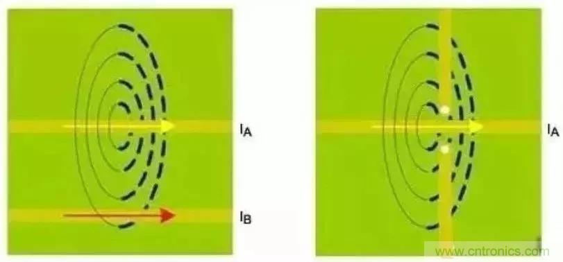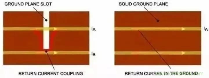 直流電流總是傾向于沿著低阻通路流通。同理,高頻電流也是優(yōu)先流過最低電阻的通路。所以,對于地層上方的標(biāo)準(zhǔn)PCB微帶線,返回電流試圖流入引線正下方的接地區(qū)域。按照上述引線耦合部分所述,割斷的接地區(qū)域會引入各種噪聲,進(jìn)而通過磁場耦合或匯聚電流而增大串?dāng)_(圖7)。