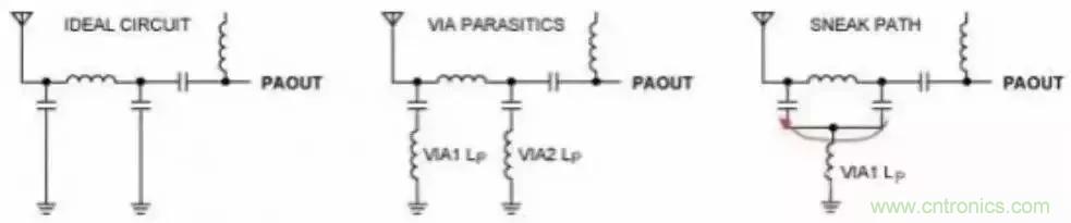 如果敏感電路共用過孔,例如π型網(wǎng)絡(luò)的兩個(gè)臂,則會產(chǎn)生其它問題。例如,放置一個(gè)等效于集總電感的理想過孔,等效原理圖則與原電路設(shè)計(jì)有很大區(qū)別(圖6)。與共用電流通路的串?dāng)_一樣3,導(dǎo)致互感增大,加大串?dāng)_和饋通。