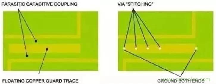 填充地也稱為保護(hù)線,通常將其用于電路中很難鋪設(shè)連續(xù)接地區(qū)域或需要屏蔽敏感電路的設(shè)計(jì)(圖8)。通過在引線兩端,或者是沿線放置接地過孔(即過孔陣列),增大屏蔽效應(yīng)。請不要將保護(hù)線與設(shè)計(jì)用來提供返回電流通路的引線相混合,這樣的布局會引入串?dāng)_。