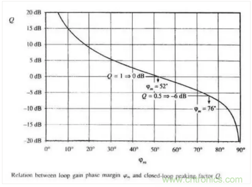 所以環(huán)路要留一定的相位裕量,如圖Q=1時(shí)輸出是表現(xiàn)最好的,所以相位裕量的最佳值為52度左右,工程上一般取45度以上.如下圖所示: