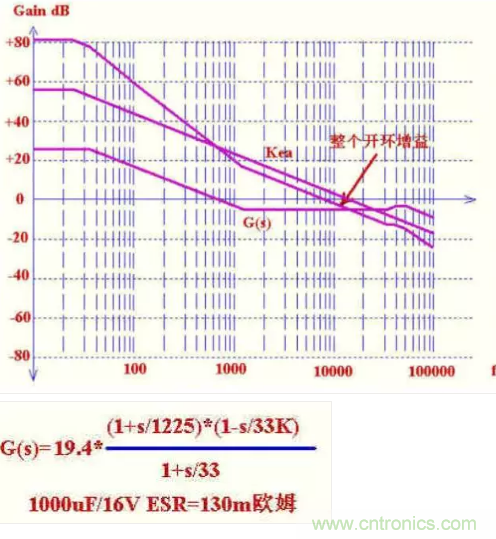 三個(gè)點(diǎn)的選取,第一個(gè)極點(diǎn)在原點(diǎn),第一的零點(diǎn)一般取在帶寬的1/5左右,這樣在帶寬處提升相位78度左右,此零點(diǎn)越低,相位提升越明顯,但太低了就降低了低頻增益,使輸出調(diào)整率降低,此處我們?nèi)?.6K.第二個(gè)極點(diǎn)的選取一般是用來抵消ESR零點(diǎn)或RHZ零點(diǎn)引起的增益升高,保證增益裕度.我們用它來抵消ESR零點(diǎn),使帶寬處保持-20db/10decade的形狀,我們?nèi)SR零點(diǎn)頻率5.3K