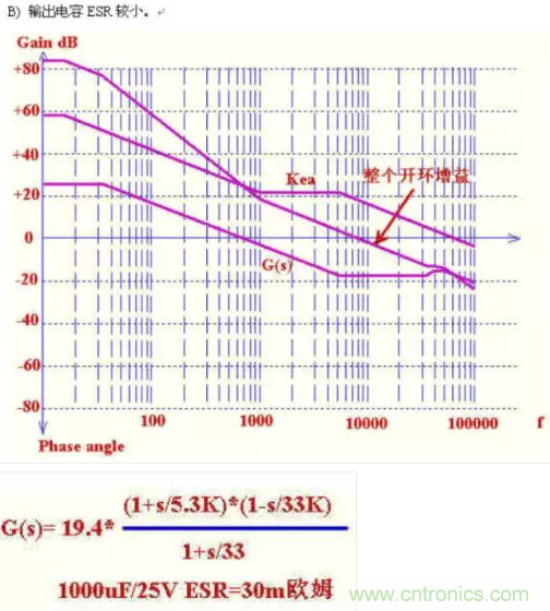 輸出濾波電容的內(nèi)阻比較大,自身阻容形成的零點(diǎn)比較低,這樣在8K處的相位滯后比較小.Phanseangle=arctan(8/1.225)-arctan(8/0.033)-arctan(8/33)=--22度.