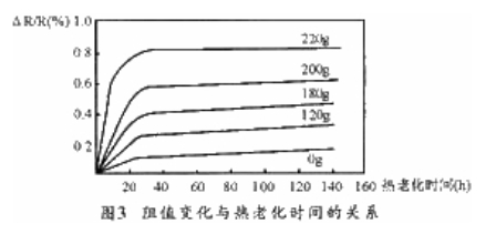 圖3所示為卡瑪線在不同拉力下繞制后,在190℃溫度熱老化過程中阻值隨時(shí)間的變化曲線。拉力越大,阻值在熱老化時(shí)的變化也越大,這說明熱處理是消除應(yīng)力影響的有效措施。