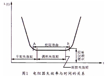 電阻器產(chǎn)品在正常條件下使用的失效可分為三種類型,即早期失效、偶然失效和耗損失效。圖1所示是電阻器失效率與時(shí)間的關(guān)系曲線。從曲線上可看出三種失效的三個(gè)階段。由于偶然失效出現(xiàn)在產(chǎn)品可靠工作的時(shí)期,研究這一時(shí)期的失效因素有重要意義。要提高產(chǎn)品的可靠性,必須加強(qiáng)產(chǎn)品對(duì)各種"應(yīng)力"所能耐受的強(qiáng)度。這里所謂的"應(yīng)力"是指對(duì)產(chǎn)品功能有影響的各種因素,如溫度、電壓電流、機(jī)械力等。