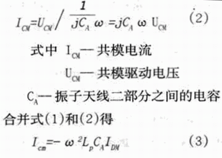 這里UCM就是產(chǎn)生共模輻射的驅(qū)動源。要產(chǎn)生輻射,除了源以外還必須有天線。這里的天線有兩部分組成,一部分是由A點(diǎn)向左看的地線部分,另一部分是由B點(diǎn)向右看的地線部分和外接電纜。其組成的輻射系統(tǒng)的等效電路如圖1(b)所示,這實(shí)際上是一付不對稱振子天線。流過天線的電流即為共模電流,可用下式表示