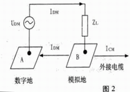 例1:在印制電路板上為了把數(shù)字部分和模擬部分隔離,常把地分割成數(shù)字地和模擬地。如果這兩部分之間有信號聯(lián)系,如圖2所示,并且數(shù)字地和模擬地的連接部分AB比較細(xì)長,存在一定電感,則差模電流IDM將在AB連接線的電感上產(chǎn)生共模驅(qū)動電壓源,從而引起共模輻射,天線一部分是數(shù)字地,另一部分是模擬地和外接地線。
