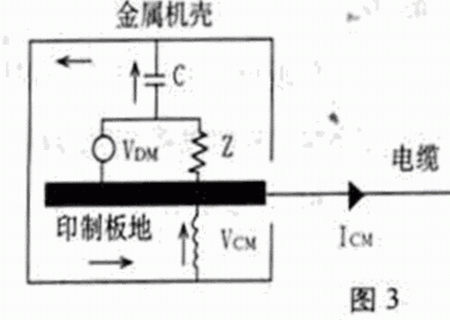 例2:印制電路板的地通過接地導(dǎo)線與機(jī)殼相連,如圖3所示。印制板上有信號線與機(jī)殼貼近,于是差模源VDM通過分布電容C耦合到機(jī)殼上,引起差模電流,該電流通過機(jī)殼和接地線又回到印制板的差模源。如果接地線存在一定的電感L,則差模電流在L上產(chǎn)生電壓降VCM,成為共模驅(qū)動電壓,從而引起共模輻射。這時天線的一部分是外接地線,另一部分是機(jī)殼。這種輻射常發(fā)生在以下情況,例如設(shè)備內(nèi)部的地址線、數(shù)據(jù)線等扁平電纜貼近機(jī)殼,分布電容較大,印制板和機(jī)殼之間的連接線細(xì)長或接觸不良等等。