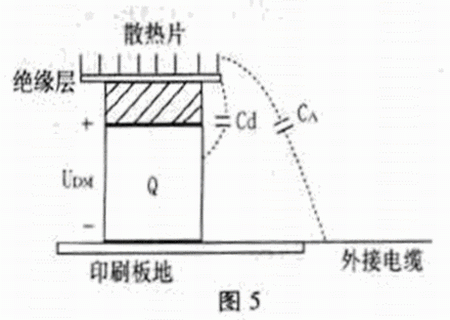 圖5是電壓驅(qū)動模式的一個實(shí)例。圖中Q是大功率的開關(guān)管,Q可看成是差模電壓源UDM,共模電流ICM的途徑是由Q通過開關(guān)管和散熱片之間的分布電容Cd到達(dá)散熱片,散熱片是共模天線的一個極。然后以空間位移電流的形式,即通過C A到達(dá)外部接線,外部接線是天線的另一個極,共模電流再由印制板地回到Q。