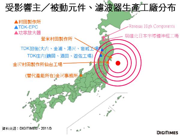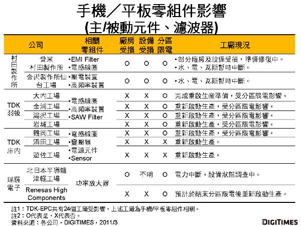 DIGITIMES Research最新報(bào)告指出,日本311強(qiáng)震造成日廠手機(jī)/平板相關(guān)零組件供應(yīng)商分別遭受廠房、設(shè)備損壞,亦或海嘯沖擊、地方分區(qū)限電等影響,工廠作業(yè)停擺,影響超過20處工廠,在災(zāi)后截至2011年3月16日仍未能正常作業(yè)。