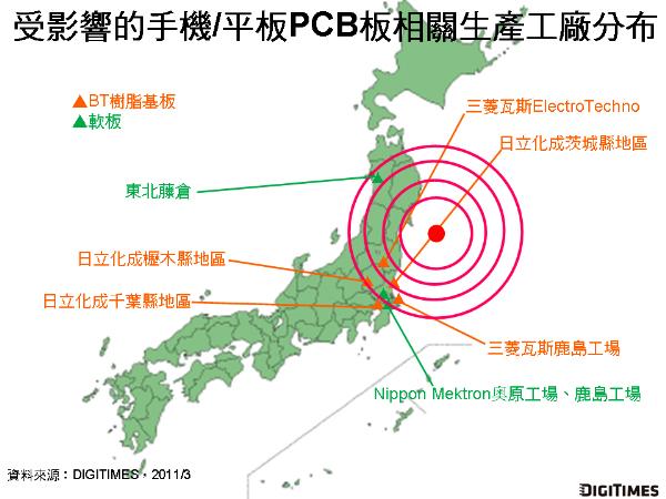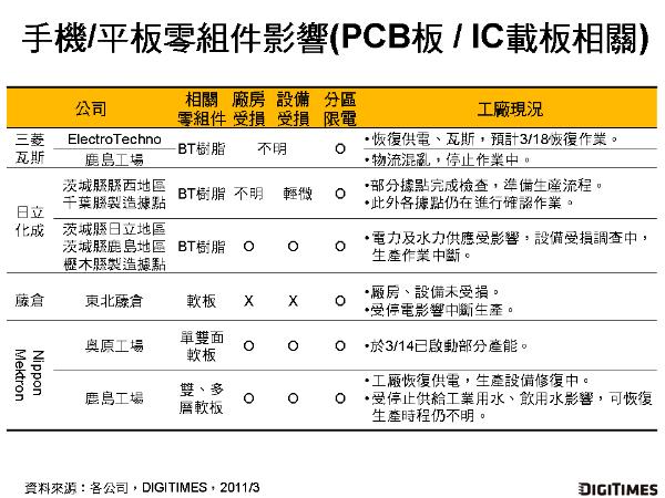 在手機(jī)/平板用PCB、IC載板材料BT樹脂等相關(guān)零組件方面,包含三菱瓦斯化學(xué)、日立化成、藤倉(cāng)、Nippon Mektron等日廠旗下工廠受地震影響作業(yè)中斷,停止生產(chǎn)。