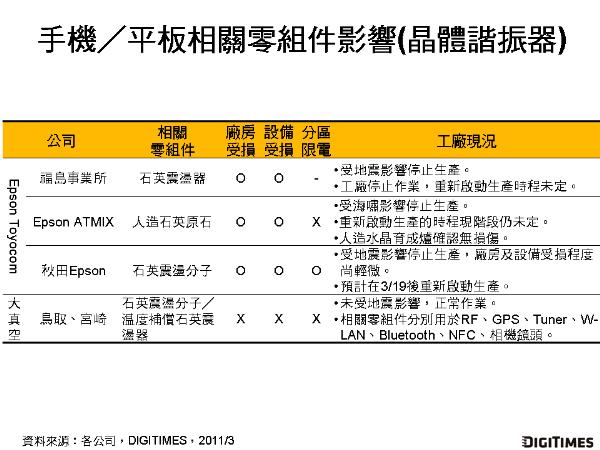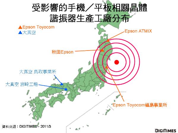 Epson Toyocom位于福島縣南相馬市的福島事務(wù)所更因廠房位于福島第1核電廠直徑16公里內(nèi),工廠作業(yè)停擺,復(fù)工時(shí)程無法估計(jì)。