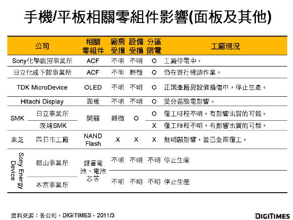 在面板、開關(guān)、存儲(chǔ)器、電池芯、異方性導(dǎo)電膜(ACF)等手機(jī)/平板相關(guān)零組件方面,除東芝位于四日市生產(chǎn)NAND Flash的工廠未受到日本311地震沖擊,其余包含TDK、日立顯示、日立化成、SMK、Sony化學(xué)、Sony Energy Device等業(yè)者的生產(chǎn)工廠,分別受到廠房、設(shè)備受損或停止生產(chǎn)的大小不等的影響。