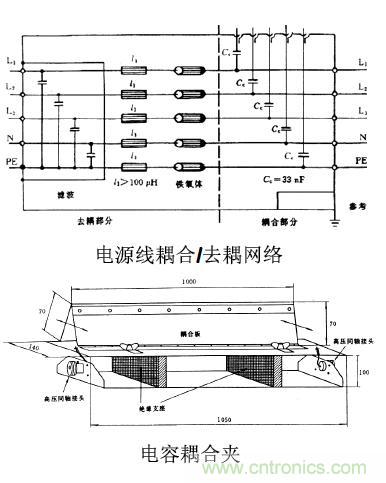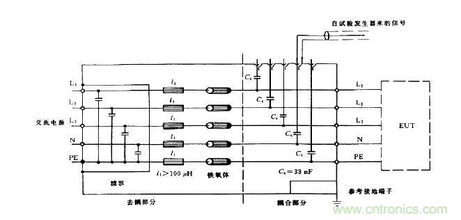 作為佐證,我們利用電源線耦合/去耦網(wǎng)絡(luò)來加以說明:在圖中可以看到從試驗(yàn)發(fā)生器來的信號(hào)電纜芯線通過可供選擇的耦合電容加到相應(yīng)的電源線(L1、L2、L3、N及PE)上,信號(hào)電纜的屏蔽層則和耦合/去耦網(wǎng)絡(luò)的機(jī)殼相連,機(jī)殼則接到參考接地端子上。這就表明脈沖群干擾實(shí)際上是加在電源線與參考地之間,因此加在電源線上的干擾是共模干擾。